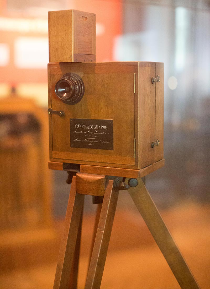 Вражений побаченим, Антуан запропонував синам удосконалити кінетоскоп таким чином, щоб «рухомі зображення» можна було переглядати колективно, проектуючи їх на екран або, як він висловився, «випустити з коробки». Технічне рішення було знайдене 20-річним Луї, який скористався створив спеціальний кулачковий механізм на основі аналогічного для швейної машинки, завдяки якому можна було переривчасто, але рівномірно, переміщувати плівку біля спеціального об'єктива, куди направлявся світловий потік прилаштованого до пристрою спеціального ліхтаря. Свій винахід Луї Люм'єр назвав «сінематограф» («той, що записує рух»), придбавши цю назву у винахідника Леона Булі, який два роки перед тим запатентував власний подібний пристрій, проте не мав грошей на його удосконалення і продовження патенту.
